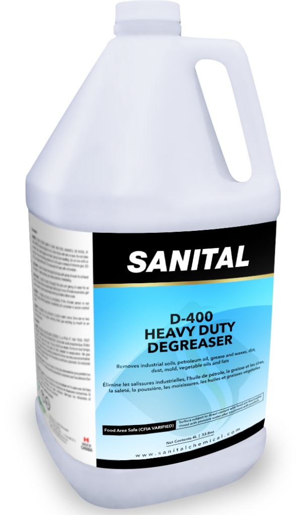 Sanital D-400 heavy duty degreaser is combination of Biodegradable solvents, environmentally safe and highly effective surfactants, corrosion inhibiters and chelating agents. It efficiently and effectively removes industrial soils, petroleum oil, grease and waxes, dirt, dust, mold, vegetable oils and fats. It is specifically designed for food handling Areas.